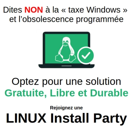 Rejoindre la communautéSoutenez notre combat contre l'obsolescence programmée et la taxe Windows en signant et partageant la pétition.